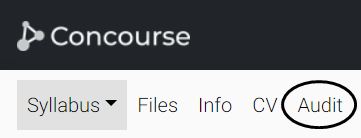 Now that you understand the stages of the audit workflow, let’s go over the use of audit in Concourse from first a syllabus editor’s perspective and then from an auditor’s perspective. Syllabus editors can access the audit area by clicking Audit on the navigation bar:
