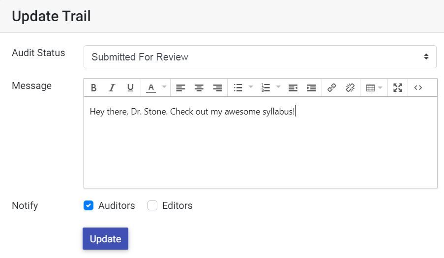 Once within the audit area, you will have the options of changing the audit status, providing some notes about the progress of the syllabus throughout the audit workflow, and alerting auditors and editors that a change has been made. Below the update form you will see the audit trail, which describes when the audit status has changed, who performed the action, and any associated messages. This will include both user- initiated (e.g. Submitted For Review) and automatic (e.g. New) entries.