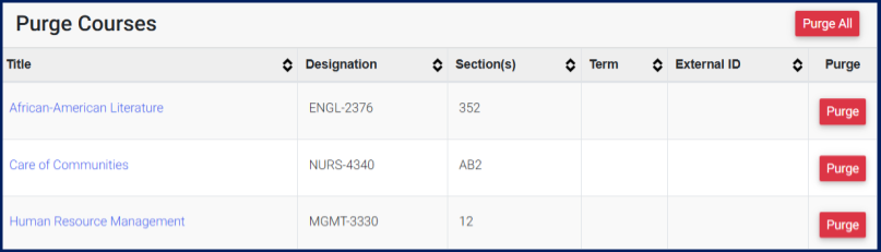 - Courses may be purged individually by selecting Purge to the right of the specified course’s External ID (if present).