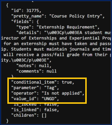 Your institution may have enabled API in your Concourse system in order to generate large amounts of data that can be used for reporting. The application of Conditional Item Logic to individual courses is revealed by the Syllabus Content API, and you can program API calls to pull this information. Specific to Conditional Item Logic, the API produces output in a JSON format that includes: